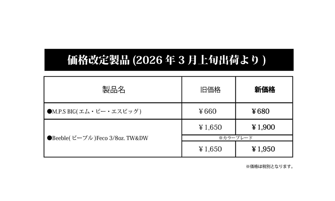 この度Fecoタックル認定商品登録にともない『M.P.S BIG(エム・ピー・エスビッグ)』を、原材料の高騰にともない『Beeble(ビーブル) Feco 3/8oz.TW・DW』の販売価格改定(値上げ)を2026年3月上旬出荷より実施させていただくこととなりました。