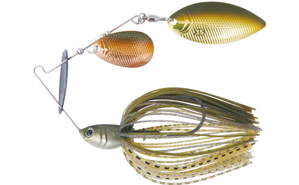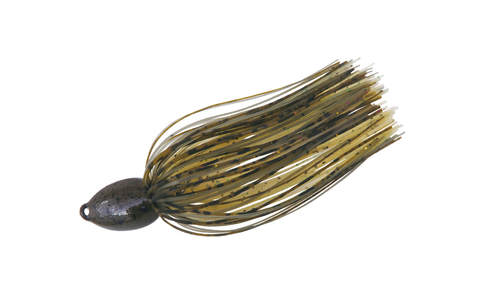 クリアウォーターや晴天時、プレッシャーにも強いダークトーンでありながら、小魚らしいフラッシングを併せ持つベイトフィッシュカラー。ゴールドの煌めきがマッディでも映えます。ブレードはコパー&メッキゴールドそれぞれにブラウンペイントを施し、濁った中での存在感は残しつつ、スカート同様“地味フラッシング”を適えました。