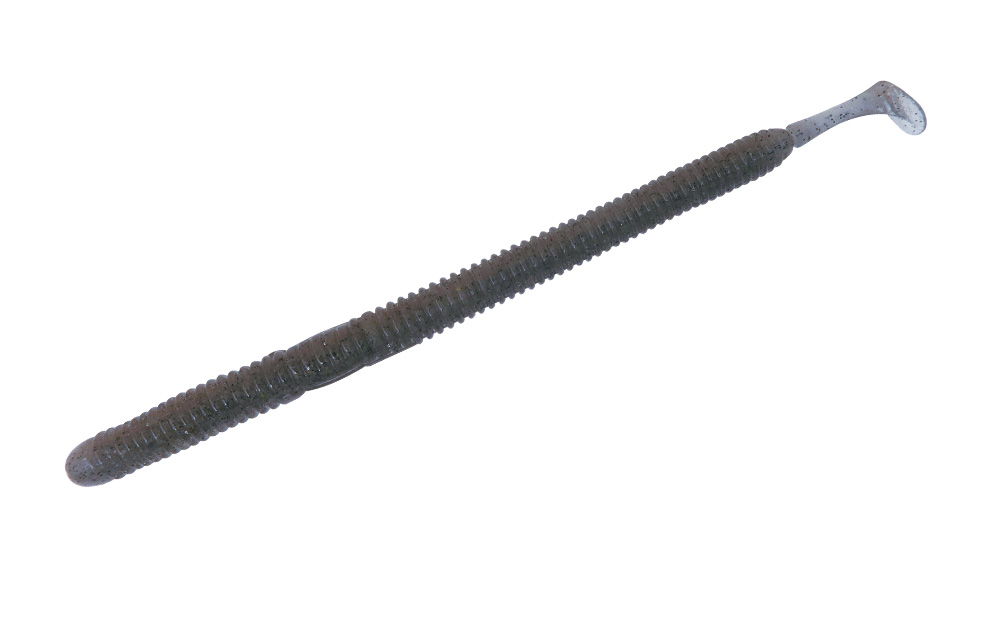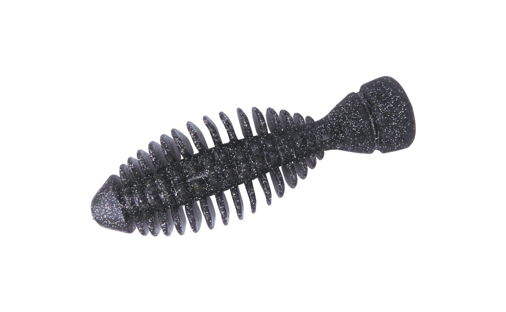 ダークスモークベースに、0.2㎜径のシルバーフレークを高密度に配合。ギミーのフラットボディがしなやかに波打つたびに艶めかしいフラッシングを放つ。ブルーギルやフナといったベイトフィッシュを偏食する状況において、より多くの反応、本気食いを引き出せるカラーです。