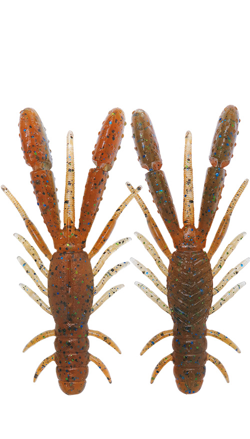 コアなファンがいるオレンジパンプキン。全体にブルー&オリーブフレークを散りばめ、腹側は微かな色調変化を生むシナモンとのツートン。ステイン~マッディでもしっかりアピールする存在感と、ナチュラルなザリ・エビらしさを両立しました。