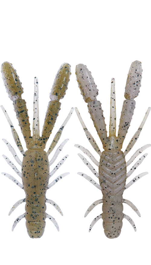 砂地や粘土質へ保護色のごとく馴染みつつも、ラメによる微細なキラメキでバスの目を惹く。クリアアップした状況やハイプレッシャー、そしてサイトフィッシングにも◎。エビや体色の薄い稚ギルをイミテートするにも最適です!